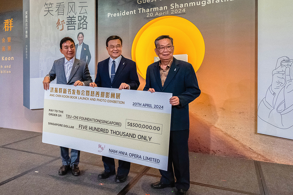 Founder and CEO of CK Group, Ang Chin Koon (left) presenting a cheque to Tzu-Chi Foundation (Singapore) CEO, Low Swee Seh (centre), and on the right, Toh Lim Mok, President of Nam Hwa Opera. (Photo by Tan Cheng Hwa)