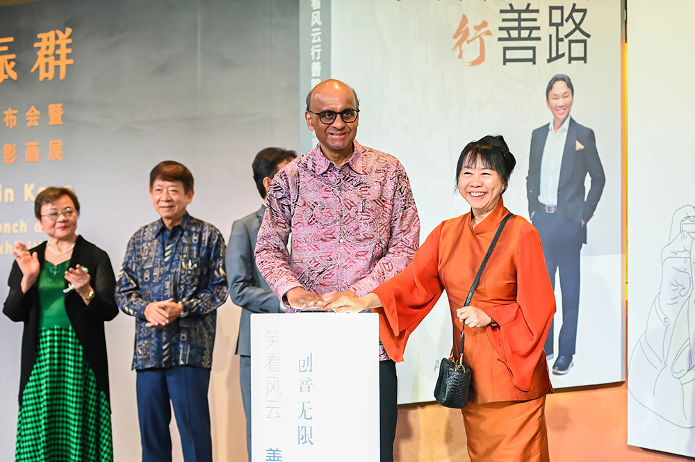 President Tharman (third from right) and his wife, Ms Jane Ittogi (second from right), pose for a group photo with Mr Ang Chin Koon (third from left), Founder and CEO of CK Group, and Mr Lin Lu Zai, President of Aspiration Fine Arts, holding Ang’s new book, “From Business Triumphs to Philanthropic Pursuits: The Memoir of Ang Chin Koon”, and a photo album titled “Infinite Creativity”. The second person from the left is special guest Mr Khaw Boon Wan. (Photo by Bong Kian Hin)