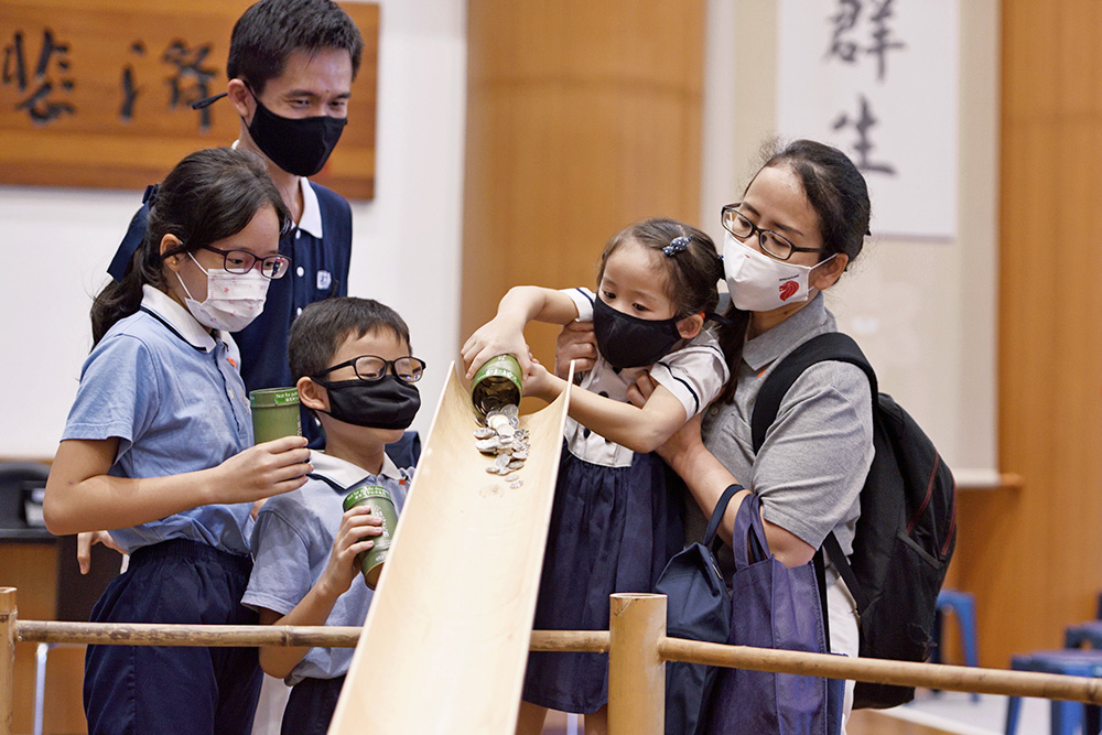 Low Yee Leong and wife, together with their three children participating in the Year End Blessing ceremony at Jing Si Hall. The children pour their savings collected in a bamboo coin bank into a jar, contributing to the pool of Tzu Chi’s merits. (Photo by Lai Tong Heng, 23/10/2021)