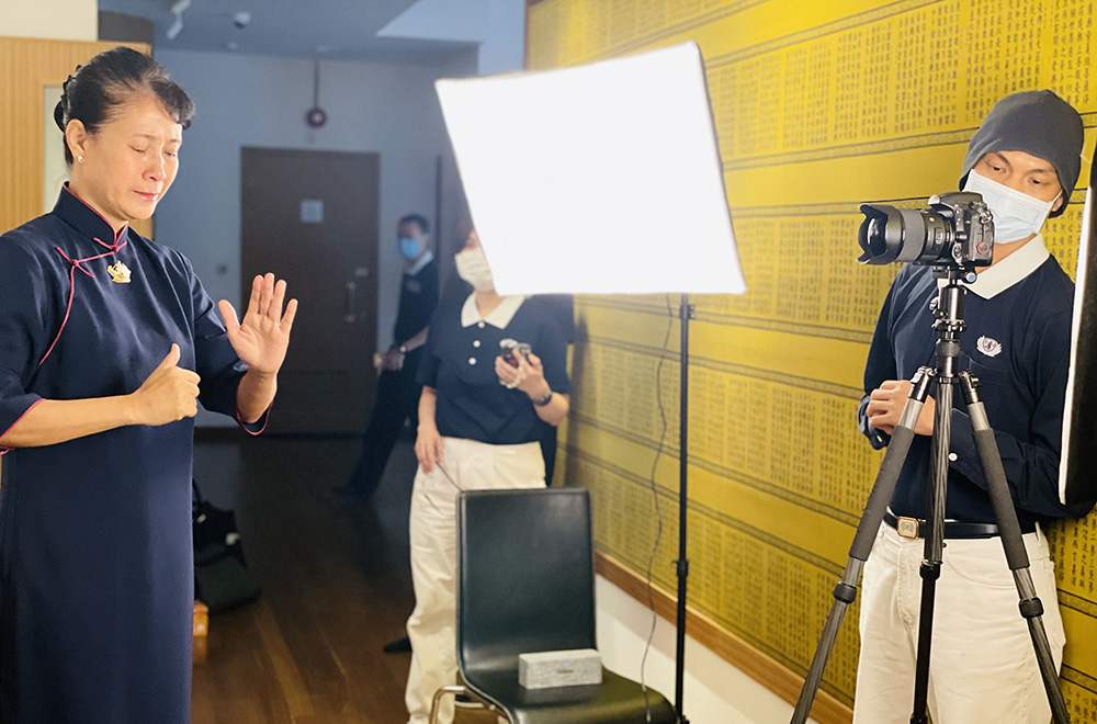 在静思堂佛堂,执行长刘瑞士(中)与周年庆协调团队们一起带动手语“一家人”,通过直播广传,凝聚所有人的法亲情缘。(摄 / 潘宝通)