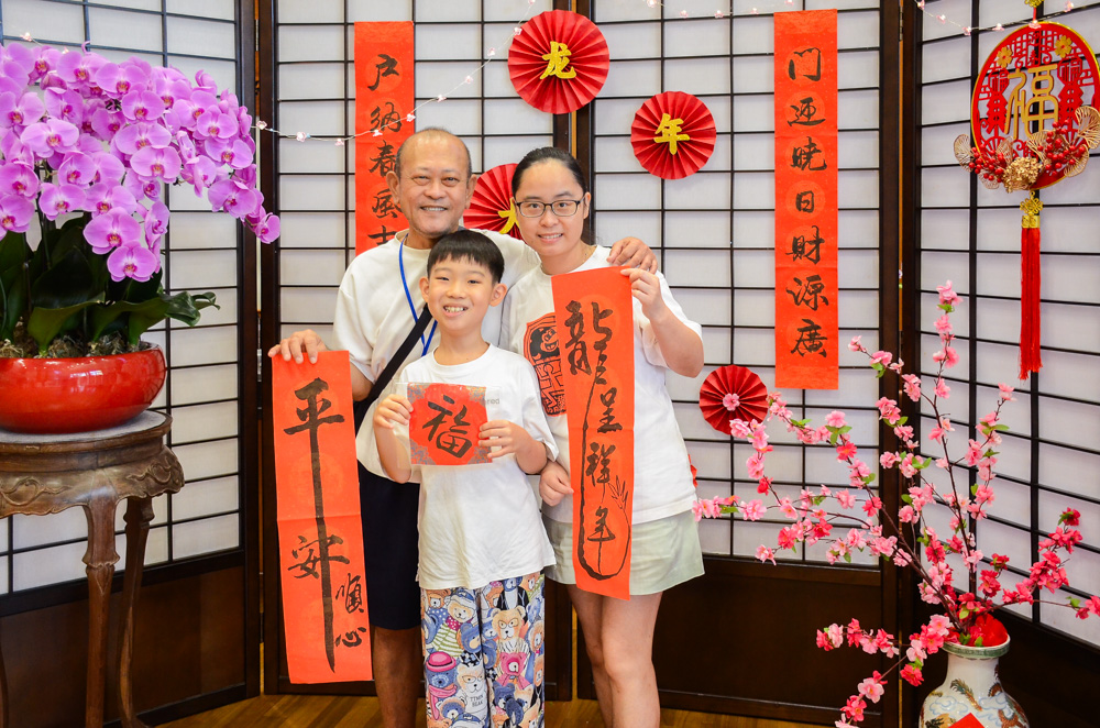 “三、二、一!新年快乐!” 等待入席用餐之前,照顾户一家在合照区拍了一张照留下欢乐瞬间。场外还有义剪服务、春联区、健康检查区、“竹筒回娘家”和灯笼DIY制作。值得一提的是,用来制作灯笼的各式红包,都是回收的红包封,小巧玲珑,美丽新颖,让人爱不释手。志工也请大家把做好的红包灯笼带回家,作为饰品点缀家居。