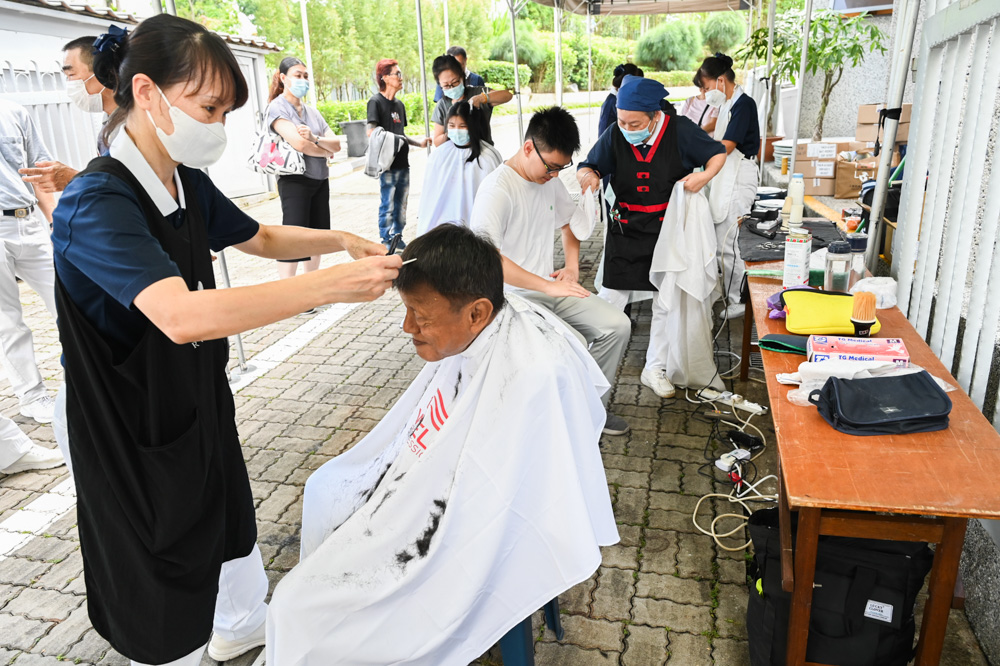 志工为白添来(右)理发迎新年。(摄/ 潘宝通)