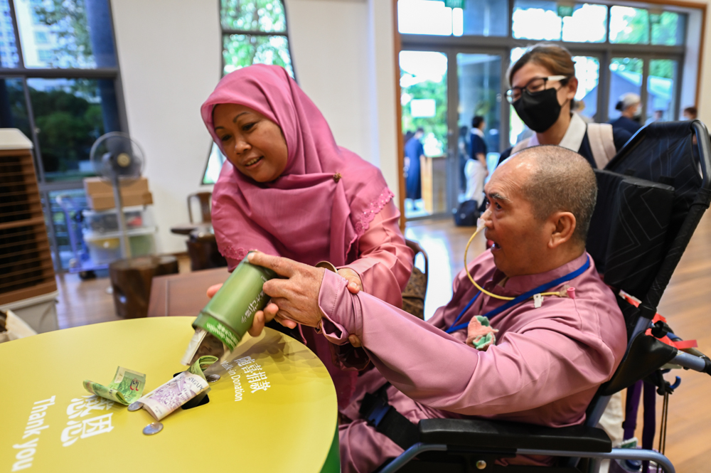 照顾户与家人投竹筒,付出一己之力,帮助世界更需要帮助的人。(摄/ 黄建兴)