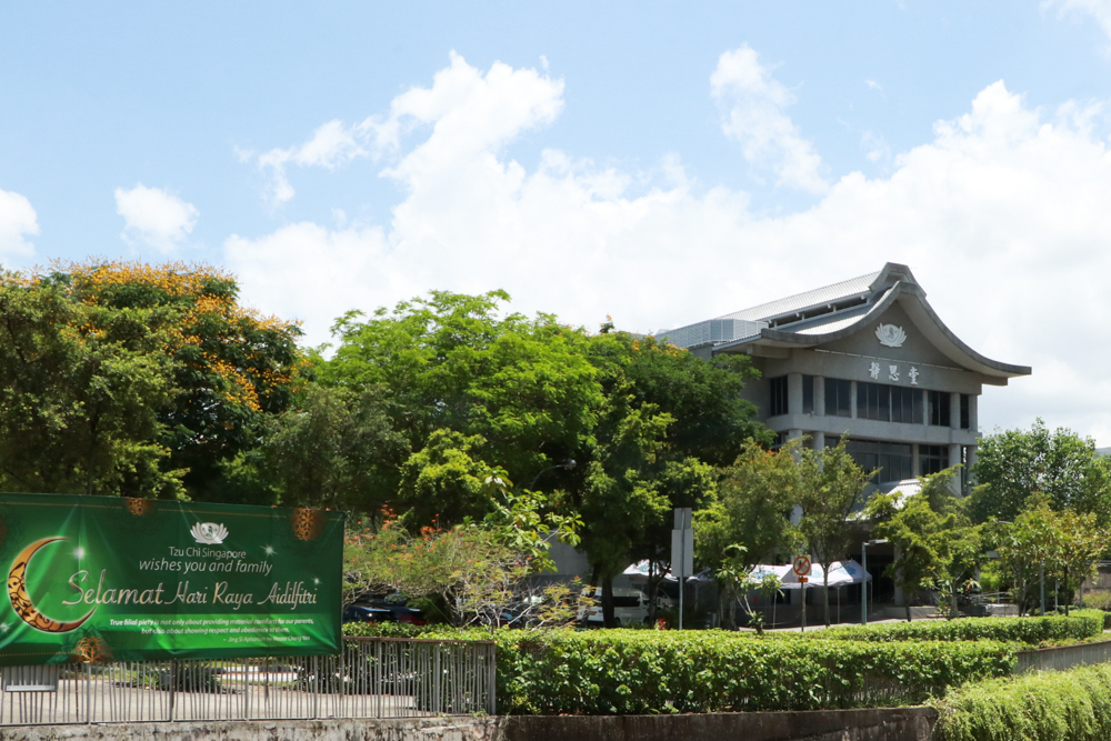 配合开斋节来临,静思堂外张挂祝贺开斋佳节布条。(摄/ 张彧瑞)