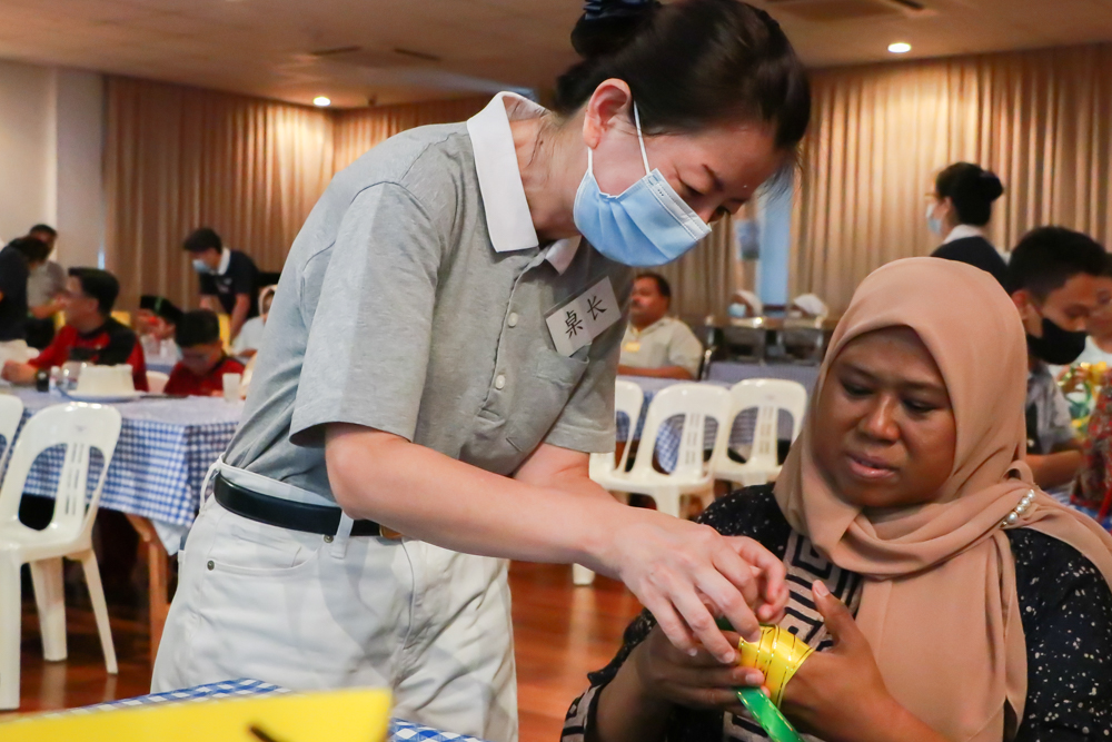 志工与照顾户一起编织马来粽吊饰。(摄/ 张彧瑞)